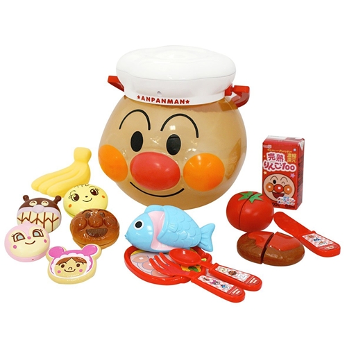 コック帽をかぶったアンパンマンのケースにおままごとアイテムがいっぱい!