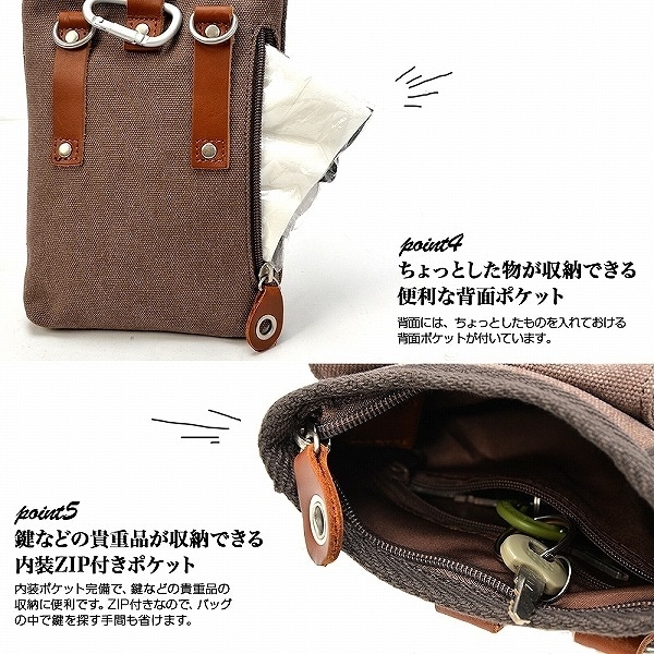 USED感を出すために、独特のケミカルウォッシュ加工を施した帆布生地を使用。また部分使いされた本革(レザー)が、ヴィンテージ感をプラス。付属のベルトでショルダーバッグとしても使用できる2way仕様。メインルームはもちろん本体前面のかぶせポケットにもスマートフォン収納可能。その他、財布や鍵など必要最低限の持ち物が収まる普段使いに便利なアイテム。<font color=””#e73656”” >※注 こちらの商品は薬品を使用するケミカルウォッシュ加工を施しております。その為、入荷時期により同じ色でも多少色目の違いやムラが生じる場合がございます。※こちらの商品は入荷時期によりカラビナの色が異なる場合があります。ご理解とご了承のうえご購入下さい。
