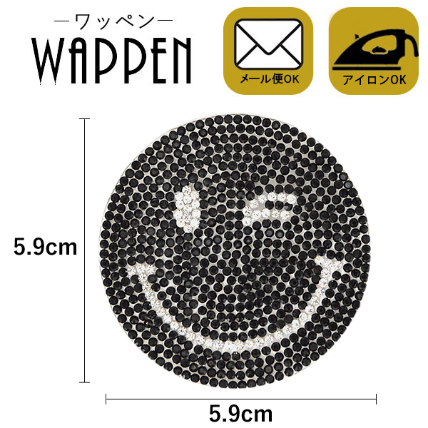 ワッペン アップリケ ストーンワッペン アイロン接着 スマイルワッペン 縦5.9cm×横5.9cm ブラック ウインク スマイル母の日 プレゼント ギフト
