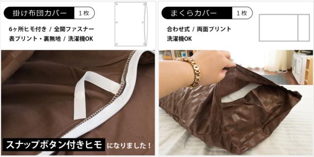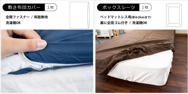 | セット内容 | 【和式タイプ】 1.掛け布団カバー(1枚) 2.敷き布団カバー(1枚) 3.まくらカバー(1枚) 【洋式タイプ】 1.掛け布団カバー(1枚) 2.BOXシーツ(1枚) 3.まくらカバー(1枚) |