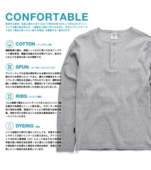 カラダのシルエットにやさしくフィットする、ストレッチ性に優れた素材を使用したデイリーウェア。使用する素材、生産工程など全てにおいて特別な拘りをもって作られたデイリーウェアの着心地の良さは、一度着ると病みつきになるほど。まさにブランドテーマである【原点に拘ったモノ造りの頂点】を象徴する一着です。生地には耐久性に優れ洗濯しても伸びにくいリブ素材を採用し、「デイリーウェア」の名に恥じないタフさを実現!単体ではもちろんの事、インナーにも使えるユーティリティーウェアとして何枚あっても困らない究極の定番アイテムです。ただシンプルなだけじゃない、それがいつまでも人気で在り続ける理由なのです。