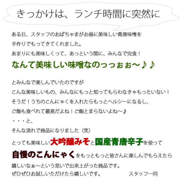 ポイント消化 青唐辛子 青唐味噌こんにゃく 180gメール便 青唐辛子味噌 惣菜 蒟蒻 みそ おかず味噌 辛味噌 ビールに合う お試し 送料無料 食品 お取り寄せ 辛 美味しい 食べ物 健康 簡単調理 健康食品 お試し 送料無料 南蛮みそ 南蛮味噌漬け ご飯のお供 常温 お歳暮