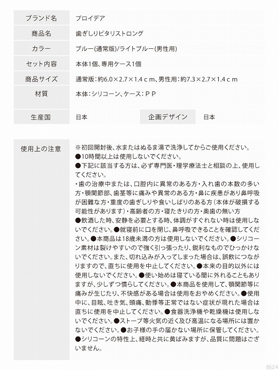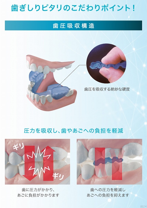 | 説明 | 歯医者さんと共同開発しました。食いしばりは、歯を激しく摩耗し、ひどい知覚過敏や歯周病を引き起こします。肩こりや頭痛、そしてなぜか腰痛やひざ痛まで引き起こし、全身の筋肉と神経を疲労させます。また、歯ぎしり音が周りに迷惑をかけるので後ろめたい気持ちになりがちです。当商品は、寝る時にはめるだけで歯ぎしりや食いしばりを簡単に防ぐことができます。噛み合わせ矯正ではないので、失敗が多い面倒な型どりが必要ありません。寝る時にはめるだけで歯圧が吸収分散し、奥歯に負担をかけることなくピタっと止まります。従来品よりも耐久性が約3倍アップ!男性でもお使いいただけるストロングタイプになりました。 |
