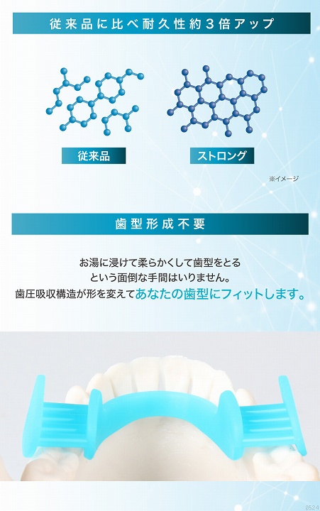 【メール便(ネコポス)対応】【2,200円以上でメール便 送料無料】歯医者さんと共同開発しました。食いしばりは、歯を激しく摩耗し、ひどい知覚過敏や歯周病を引き起こします。肩こりや頭痛、そしてなぜか腰痛やひざ痛まで引き起こし、全身の筋肉と神経を疲労させます。また、歯ぎしり音が周りに迷惑をかけるので後ろめたい気持ちになりがちです。当商品は、寝る時にはめるだけで歯ぎしりや食いしばりを簡単に防ぐことができます。噛み合わせ矯正ではないので、失敗が多い面倒な型どりが必要ありません。寝る時にはめるだけで歯圧が吸収分散し、奥歯に負担をかけることなくピタっと止まります。従来品よりも耐久性が約3倍アップ!男性でもお使いいただけるストロングタイプになりました。