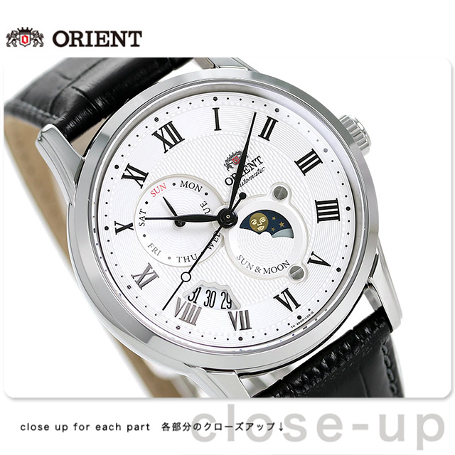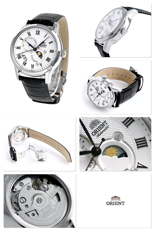 正規品 7年保証キャンペーン 送料無料 オリエント クラシック サン&ムーン 42.5mm 自動巻き ペアウォッチ メンズ 腕時計 RN-AK0005S ORIENT CLASSIC SUN&MOON アナログ ホワイト×ブラック 革ベルト ◆オリエントより、サン&ムーン表示を搭載したモデルが登場。クラシックなデザインに、モダンなエッセンスを加えた、太陽と月による昼夜の表示が立体的でユニークなウォッチです。インデックスはローマ数字で、エレガントな雰囲気に仕上げました。カジュアルからスーツスタイルまでシーンを選ばず腕元を飾ります。型打ち模様を施した文字盤もポイントです。 発売日:17年11月発売 機械式腕時計