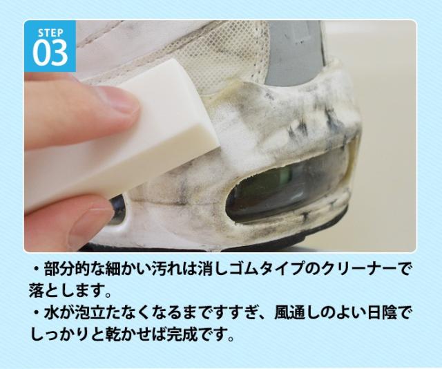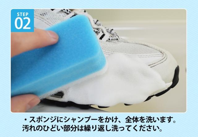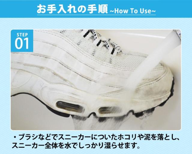 ■内容物スニーカーケアシャンプー スニーカーケアスポンジ 部分汚れ落とし用消しゴム■ご使用方法ブラシなどを使い、スニーカーについたホコリや泥を落とします。 その後、スニーカー全体を水でしっかり湿らせます。 ※靴ひもは外します。 スポンジにシャンプーをかけ、軽くもみ込んでから全体を洗います。汚れのひどい部分は繰り返し洗ってください。 ※白色の不織布面は、傷つきやすい素材(天然皮革)には使用しないでください。 ・水が泡立たなくなるまでよくすすぎ、風通しのよい日陰でしっかりと乾かします。 部分的な汚れは消しゴムタイプのクリーナーで汚れを落とします。
