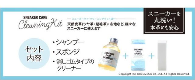 スニーカーの汚れをしっかり落とす!シューケアラインとして高い評価を得ている「コロンブス」より、スニーカー用シャンプー、スポンジ、消しゴムタイプのクリーナーをセットにしたクリーニングキットが登場。天然皮革や合成皮革、布地など様々な靴に使用可能。せっけんタイプ(ウォータリーサボン)の老若男女問わず好感を持たれる香りです。特別なシーンはもちろん、普段のエチケットとしてオススメの商品です!