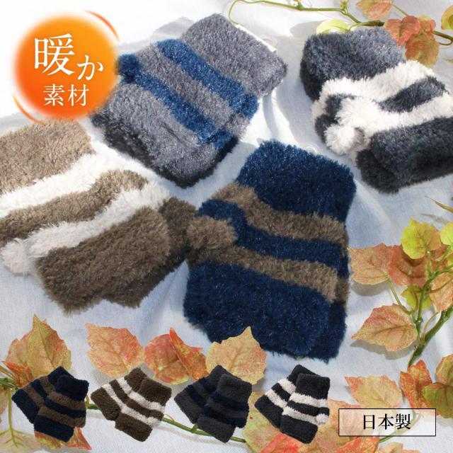 日本製機能糸TACTEL使用 レディース手袋 スマホ対応 指切り 軽量、保湿、あったか手袋(ブルーXカーキ)