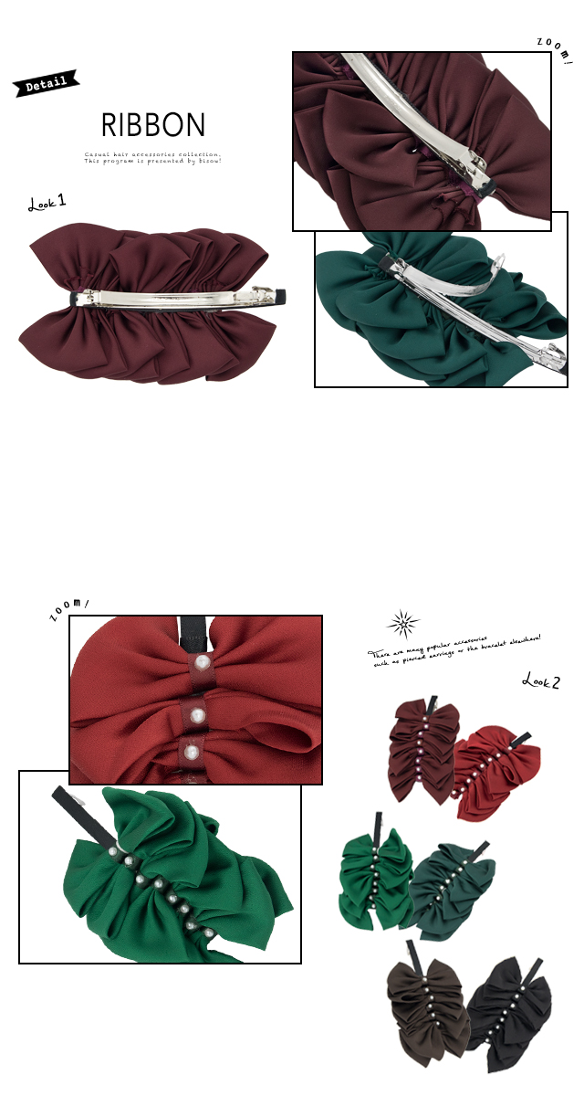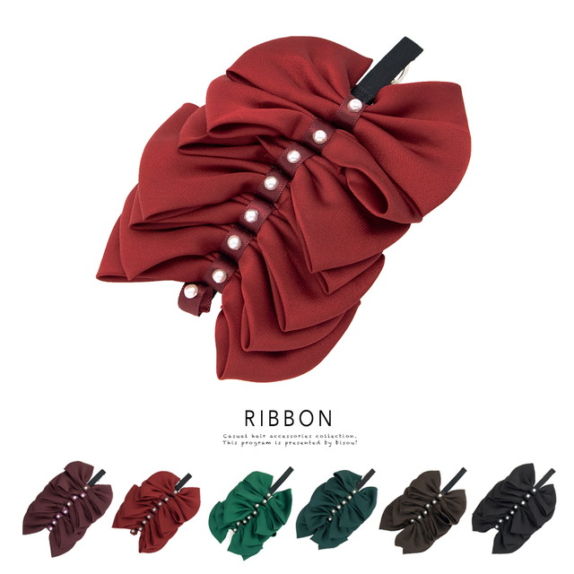 【連なったリボンとパールがキュートでガーリーなバレッタ】上品/リボンタイ/ヘアアクセサリー