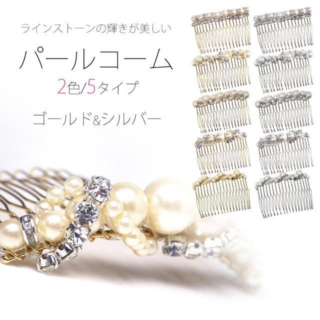 ヘアアクセサリー パールコーム ゴールド シルバー【イミテーションパール ラインストーン 髪飾り 櫛 コサージュ 和装】-3800