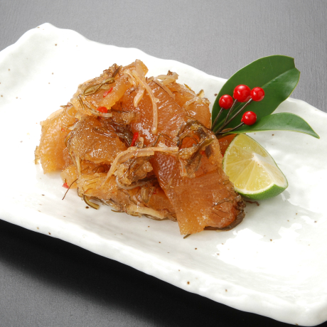 ○原材料:数の子(オランダ、アメリカ、ロシア、カナダ産)、いか加工品(いか、砂糖、食塩)、しょうゆ、昆布、たん白加水分解物、かつお調味液、食塩、砂糖、唐辛子/ソルビット、調味料(アミノ酸等)、増粘多糖類、(一部に小麦、大豆、いかを含む)