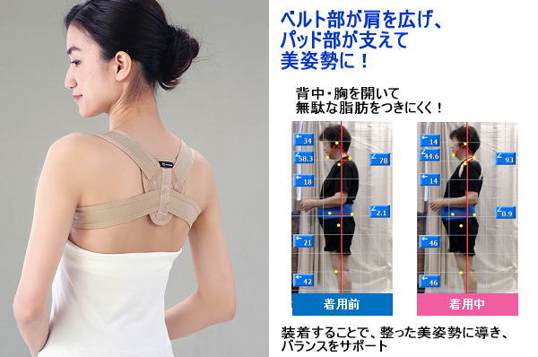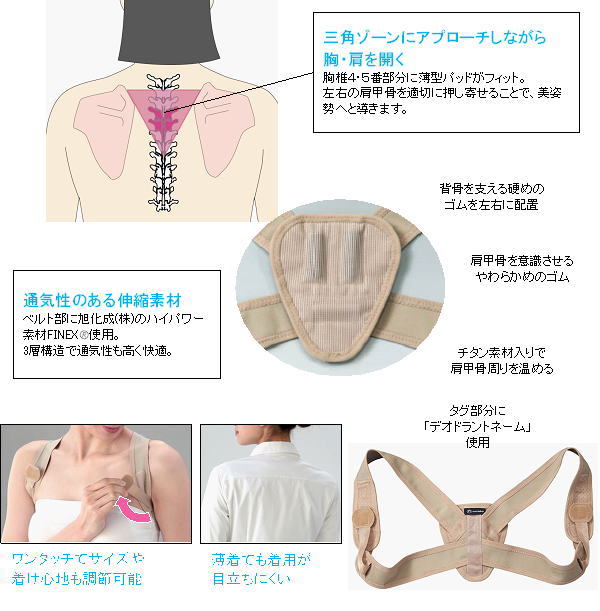 たすき掛けから発想したサポーター!ベルト部が肩を広げ、パッド部が支えることで美姿勢へと導きます。胸椎4・5番部分の三角ゾーンにフィットする薄型パッドには2種類のゴムを内蔵。肩甲骨や背骨を支えます。チタン素材入りのパッドで肩甲骨周りを温め、血の巡りもサポートします。ベルト部には旭化成せんい(株)のハイパワー素材FINEX【サイズ・重量】サイズ:(約)55×13×1.5cm 適応サイズ:胸囲/M:80〜88cm、L:88〜96cm 上腕囲/M:22〜27cm、L:27〜32cm 肩幅/M:35〜40cm、L:40〜45cm 重量:(約)25g【材質】ナイロン、ポリウレタン、その他(パッド:ゴム) ■備考/M:婦人服7〜9号相当 L:婦人服11〜13号相当【生産国】日本【個装サイズ・重量】個装サイズ:(約)18×22×3cm 個装重量:(約)65g【JAN】4519995432599:M 4519995432605:L