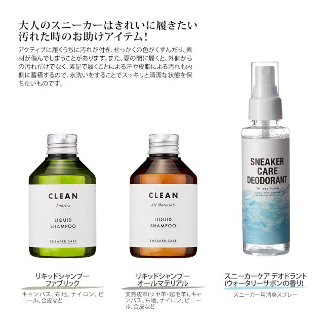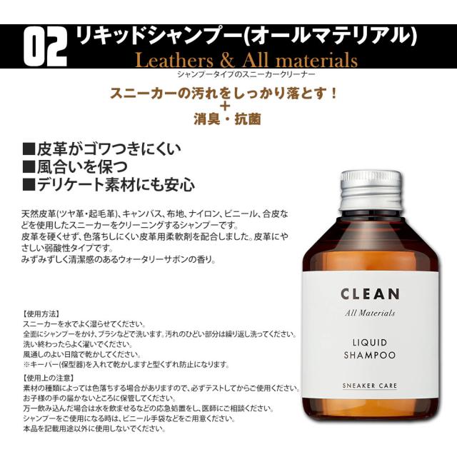 天然皮革(ツヤ革・起毛革)、キャンバス、布地などを使用したスニーカーをクリーニングするシャンプーです。