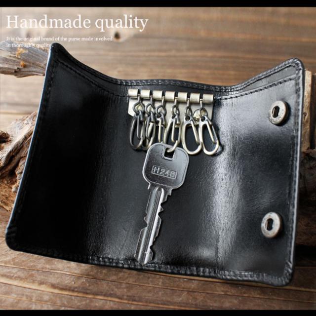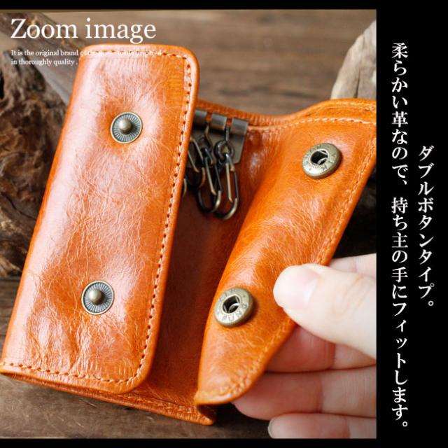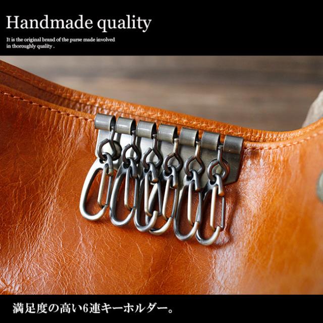 艶やかな表面に革本来のシボの自然な表情や質感を活かした、オイル仕上げのバロンレザーを使用して製作したキーケースです。シンプルに2枚の革を縫い合わせ、ボタンで留める3つ折りタイプの中には6つのキーホルダーにマルチポケットがあります。