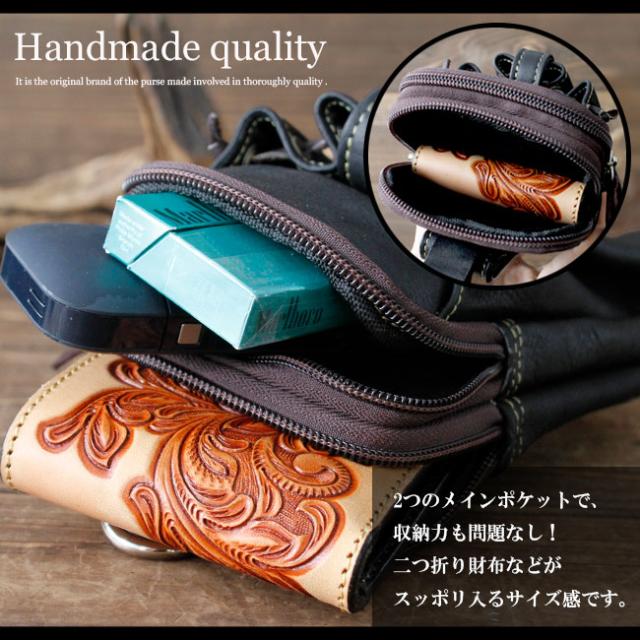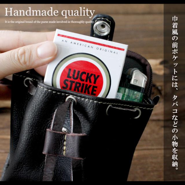 柔らかくて手触りのいい上質なカーフスキンを使用してハンドメイドで製作したレザーマルチケースです。スマホやタバコ、アイコス、グローなどの収納に丁度いいサイズになっています。ボタンタイプのベルトループでベルトに簡単に装着もでき、上部のDカンにカラビナ(別売り)を付けることもできます。メインポケットはダブル仕様となっており、前面の巾着型ポケットはデザインのアクセントになっています。