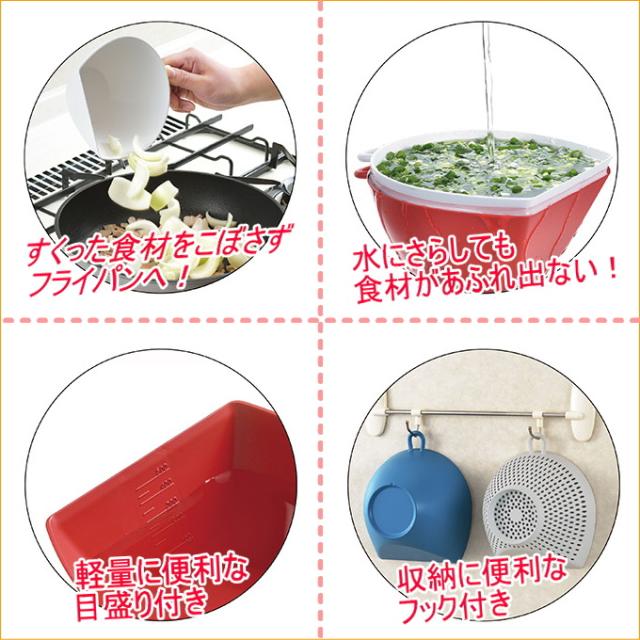 | 特徴 | まな板の上で切った食材をサッとすくい取ることができるザルとボウルのセットです。 ボウルに目盛りが付いているので計量にも使えます。 ザルとボウルを重ねて水にさらしても食材があふれ出ないのでとても便利です。 収納に便利なフック付き。 電子レンジ加熱OK、食器洗い乾燥機対応。 ■その他の調理道具などはこちら↓ 調理道具 |