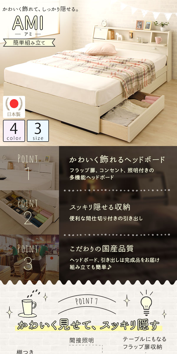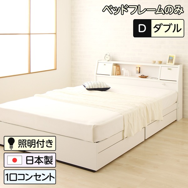 日本製 照明付き フラップ扉 引出し収納付きベッド ダブル (フレームのみ)『AMI』アミ ホワイト 宮付き 白 【北海道・沖縄・離島配送不可】
