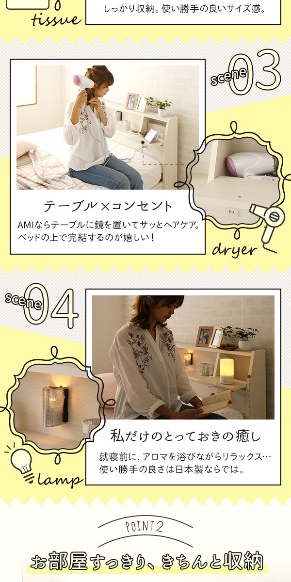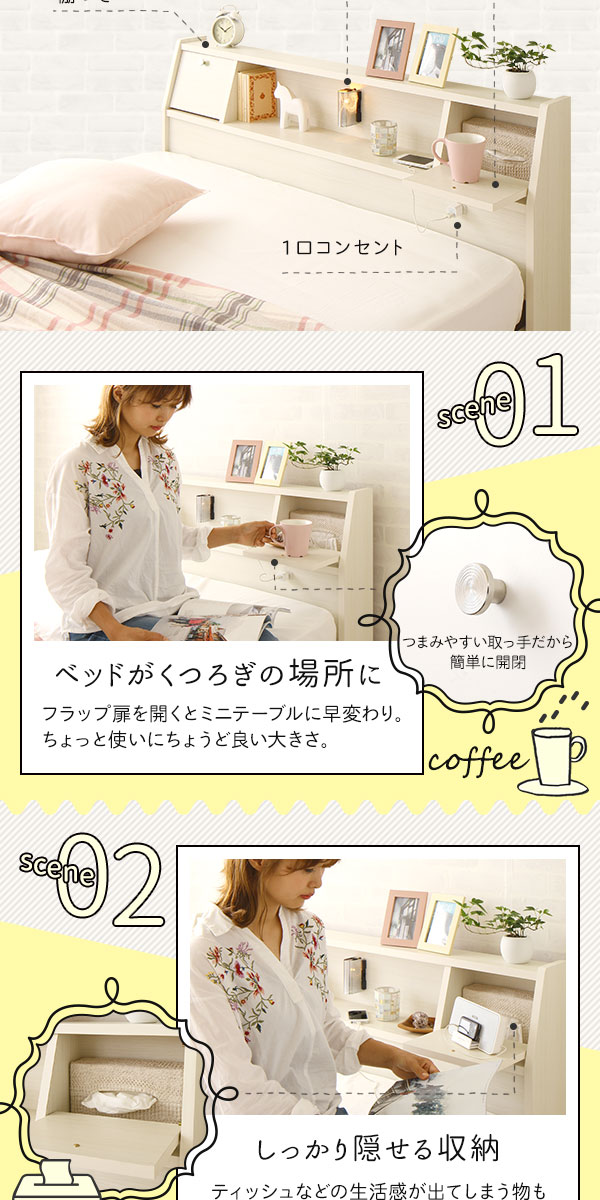 オープンスペースにはお気に入りの雑貨などを飾って、隠したいものは扉の中に収納できます。収納部のフラップ扉はテーブルにもなり、ベッドでのくつろぎタイムに便利です。コンセントも照明も付いていて、見た目の可愛さだけではなく多機能で優秀なヘッドボードです。