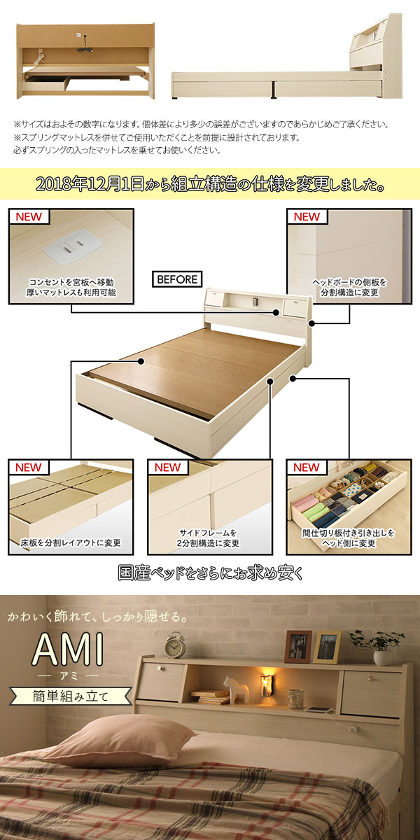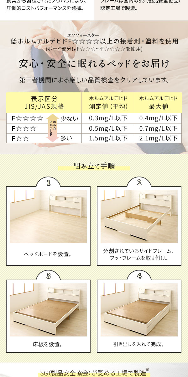 ヘッドボードと引き出しは国内工場で組み立て済みの完成品だから