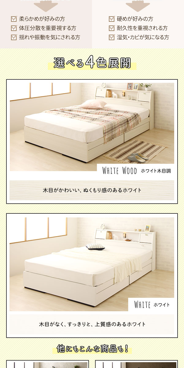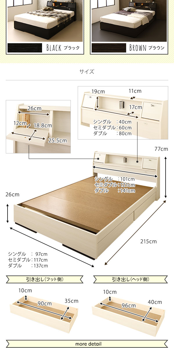 ●大型商品のため、複数購入時は追加送料がかかる場合がございます。 ■サイズ(約) ベッドフレーム/ シングル 幅101cm×長さ215cm×高さ77cm セミダブル 幅121cm×長さ215cm×高さ77cm ダブル 幅141cm×長さ215cm×高さ77cm 引出し内寸 (大)幅96cm×奥行40cm×高さ10cm (小)幅90cm×奥行35cm×高さ10cm ■梱包サイズ・重量(約) ベッドフレーム/ シングル 1.幅104cm×奥行30cm×高さ80cm (18kg) 2.幅205cm×奥行10cm×高さ8cm (9kg) 3.幅101c...