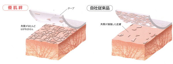 ![]() | ・角質層をほとんど剥離せず、貼り替えによる刺激を和らげます。 ・粘着面に角質層が付着しませんので、粘着力が低下しません。 ・従来の優肌絆不織布に比べ皮膚粘着力がアップし、 重ね貼りしやすくなりました。 ・ミシン目を入れ、手切れ性が向上しました。 |