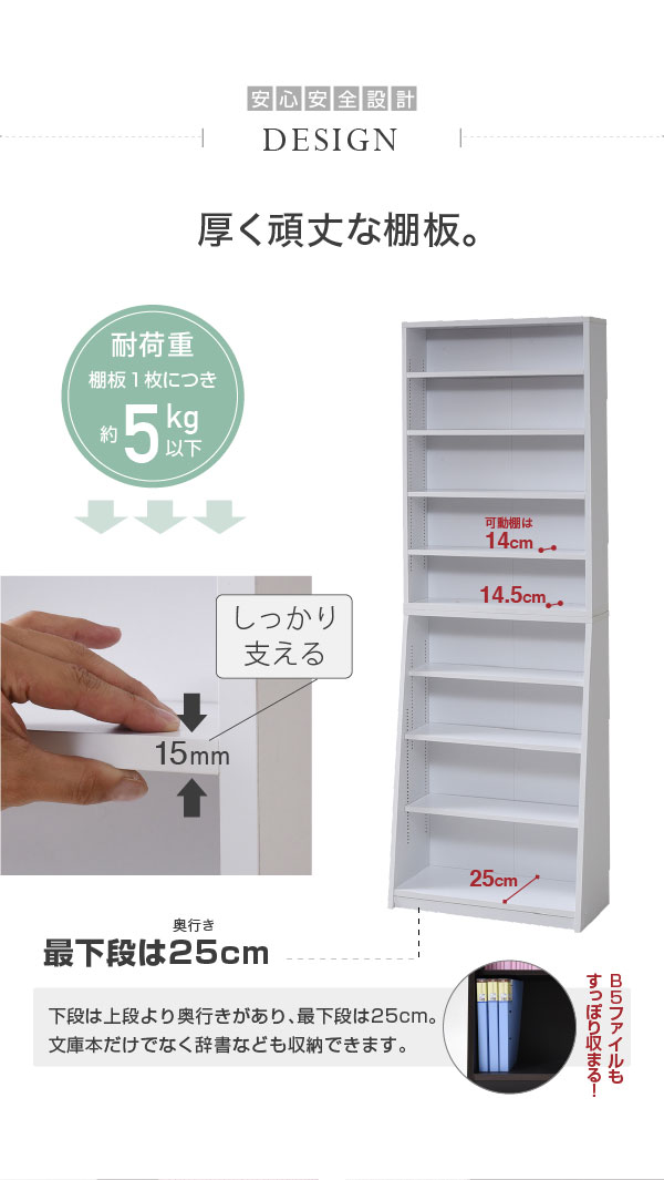■商品説明 棚板を1cm間隔で調整できるので、本だけでなく、ディスプレイラックとして使える万能本棚。お部屋に合わせて選べる60幅、90幅をご用意。組み合わせて使えば、120幅、150幅としても使える大容量の文庫本ラック。薄型なのでお部屋を圧迫せず、スッキリ収納できます。