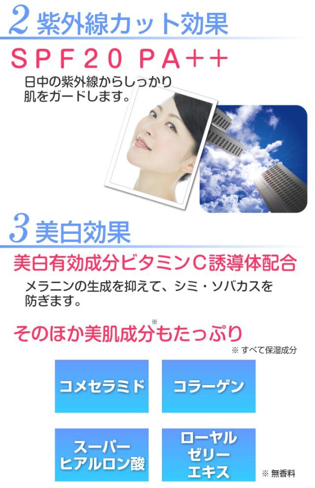 有効成分L−アスコルビン酸2−グルコシドその他の成分アセチル化ヒアルロン酸ナトリウム、水溶性コラーゲン液、セイヨウサンザシエキス、ローヤルゼリーエキス、米ヌカスフィンゴ糖脂質、水添卵黄レシチン、卵黄リゾホスファチジルコリン、天然ビタミンE、合成金雲母−2 、合成金雲母、セリサイト、マイカ、タルク、無水ケイ酸、含水ケイ酸、雲母Ti、ステアリン酸Zn、ステアリン酸、水酸化Al、メチルシロキサン網状重合体、架橋型シリコーン・網状型シリコーンブロック共重合体、スクワラン、リンゴ酸ジイソステアリル、ワセリン、セスキイソステアリン酸ソルビタン、BG、微粒子酸化Ti、酸化Ti、酸化Zn、粘度調整剤、フェノキシエタノール、エチルパラベン、黄酸化Fe、黒酸化Fe、ベンガラ