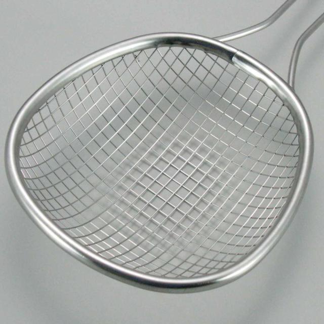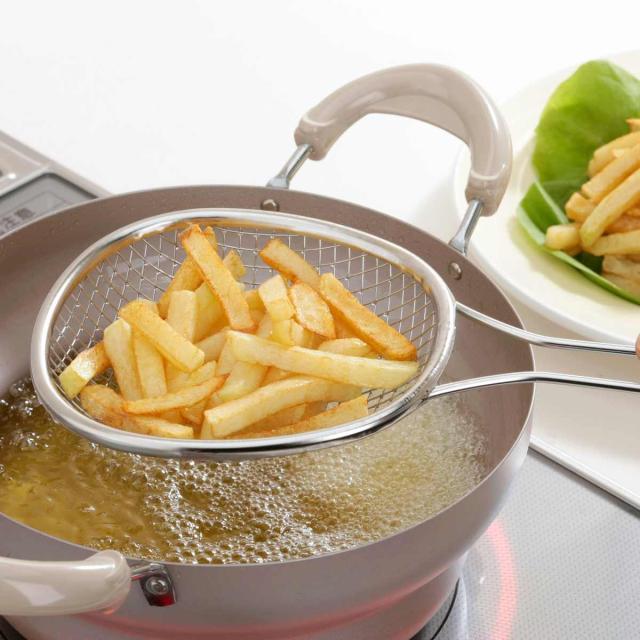 から揚げなどの揚げ物を引き上げるのに便利なストレーナーです。サッとすくって、素早く油切りができるので、フライドポテトも一度にまとめてすくえます。