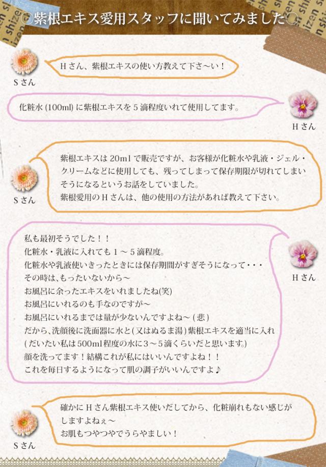 | 〇 | 当社製品の、ベイシック化粧水・ベイシックジェル・ベイシッククリームに混ぜていただく事で紫根の基礎化粧品が作れます。 |