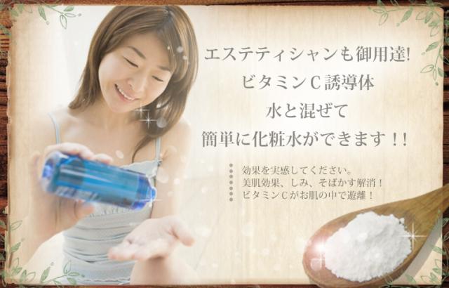 ビタミンC誘導体には、リン酸-L-アスコルビン酸ナトリウム型と、リン酸-L-アスコルビン酸マグネシウム型がありますが、マグネシウム型よりも当商品のナトリウム型の方が、皮膚内でビタミンCに変化しやすいので高級エステサロンで使われる定番となっています。