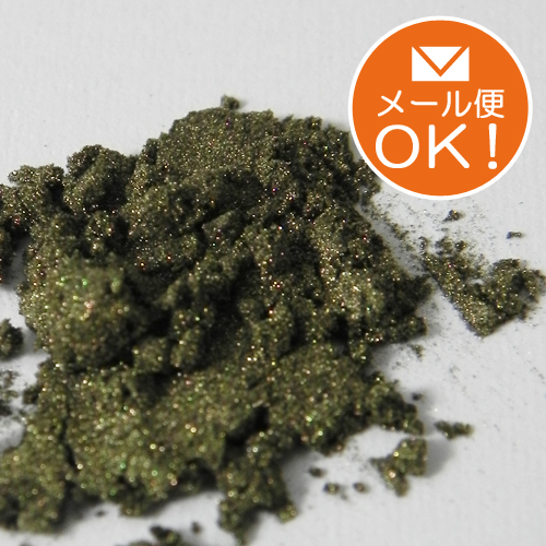 化粧品グレードの着色顔料。黒がベースの緑色を帯びた金色。中間の色調です。