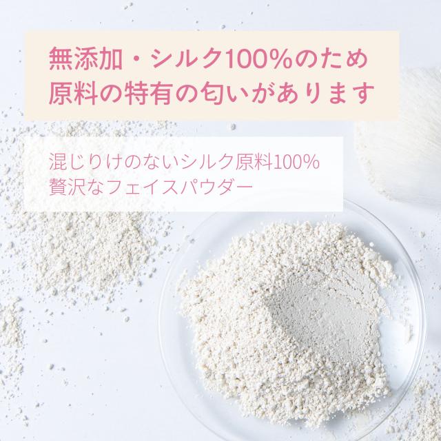 ・シルクパウダーは100%タンパク質でできていますが、小麦アレルギーや、卵アレルギーなど食物にアレルギーのある方や、お肌が弱い方には、お肌に異常が現れる場合がございます。