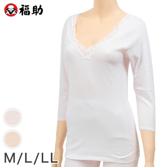 福助 インナー 綿100% 7分袖 シャツ レディース M〜LL フクスケ 長袖 肌着 下着 女性 vネック コットン 婦人 レース (在庫限り)