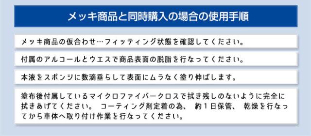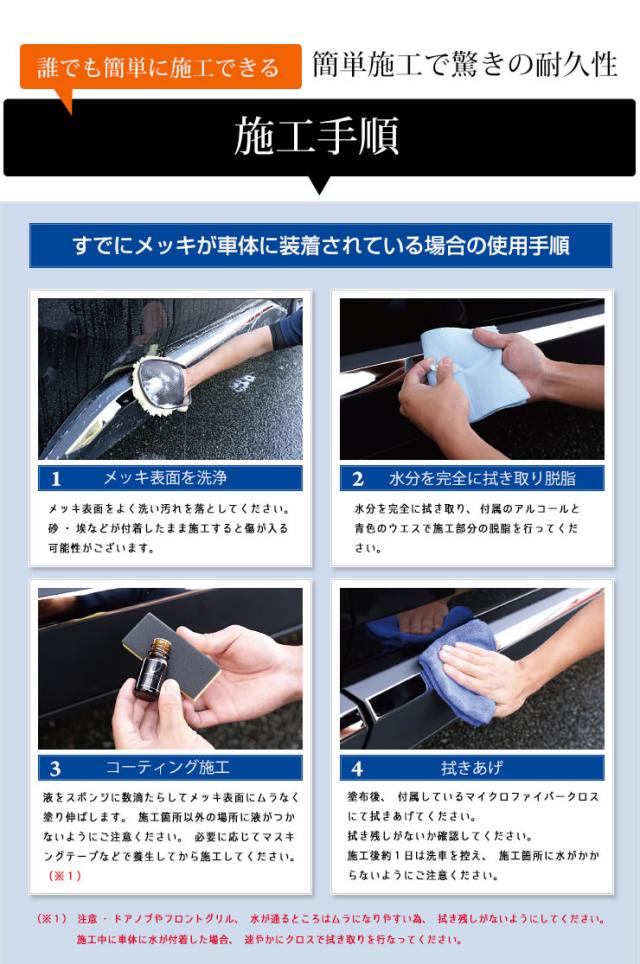 - 耐久性に不安のある社外メッキパーツの保護におすすめです。付属の脱脂クリーナーと分かりやすい説明書があるのも良いです。