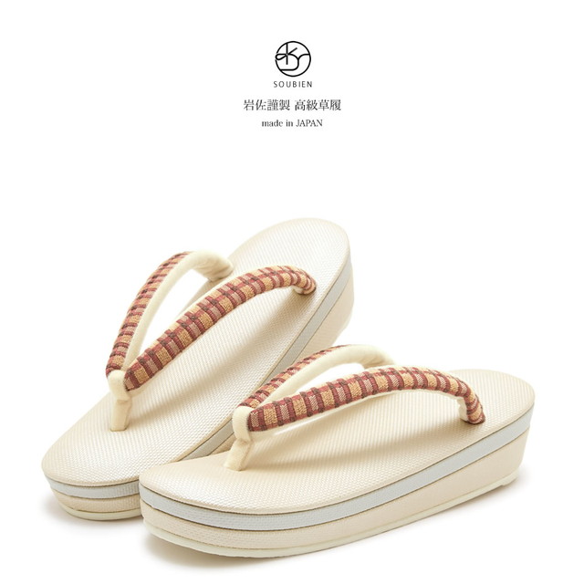 草履 レディース 岩佐謹製 白茶色 ライトベージュ 赤茶色 格子 チェック 帆布 二枚芯 ぞうり 和装履物 カジュアル 女性用 日本製 【Mサイズ】