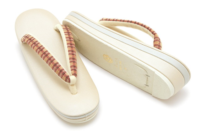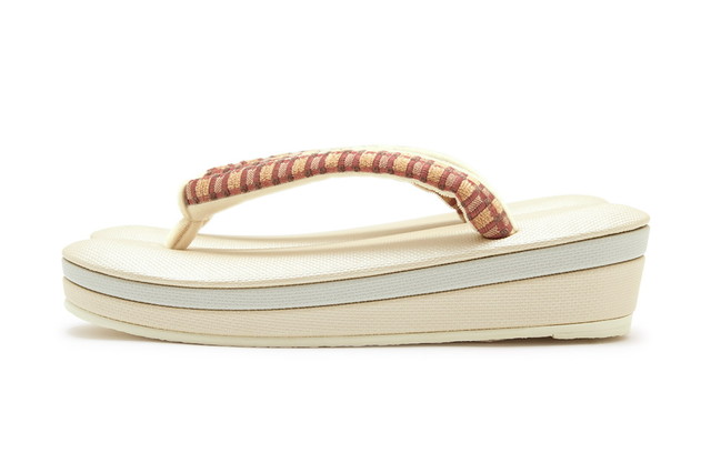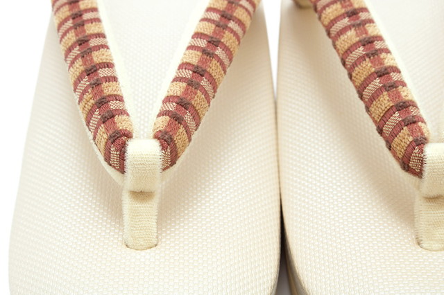 刺繍とパイル織で格子がデザインされた鼻緒が挿げられています。