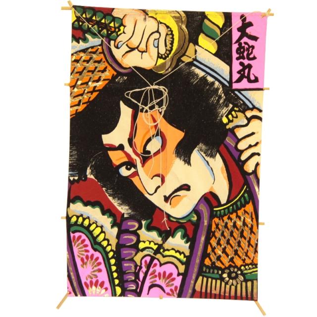 蛇の使い手大蛇丸と宿敵蝦蟇かえるの使い手の児雷也「にらみ」との歌舞伎絵です。歌舞伎の「にらみ」は邪気を追い払い、正月の意匠に相応しいです。