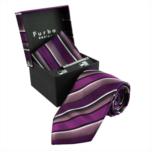 フルボ デザイン 紳士ネクタイ パープル系 チーフ、タイバー、カフスの4点セット ギフト プレゼント 贈答品