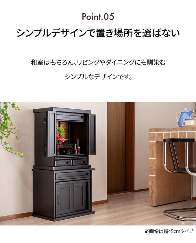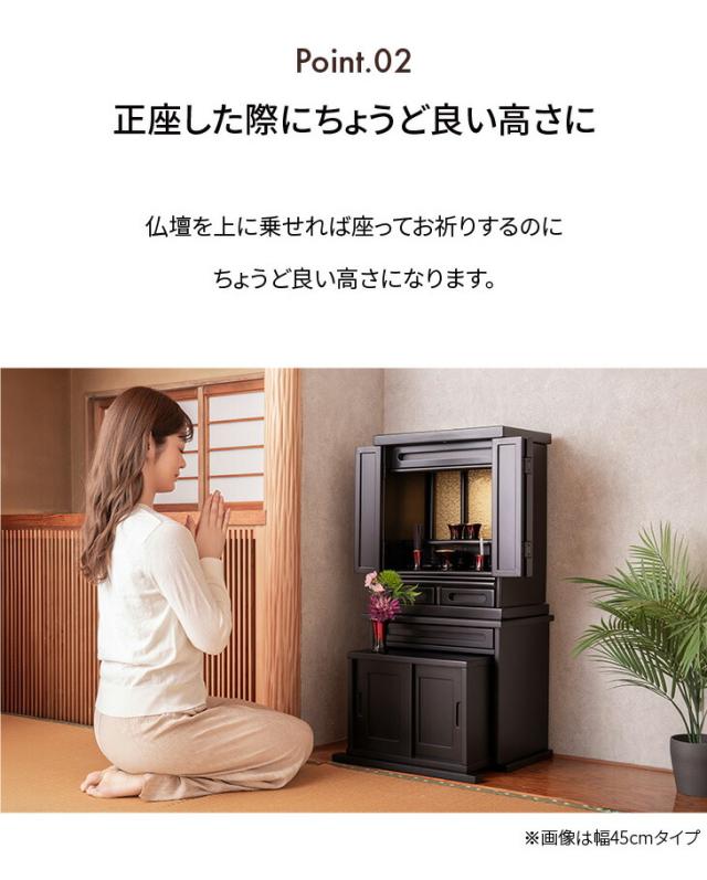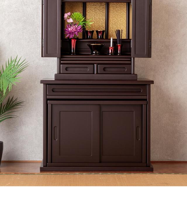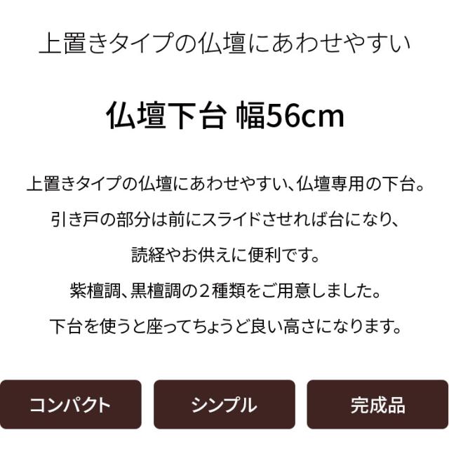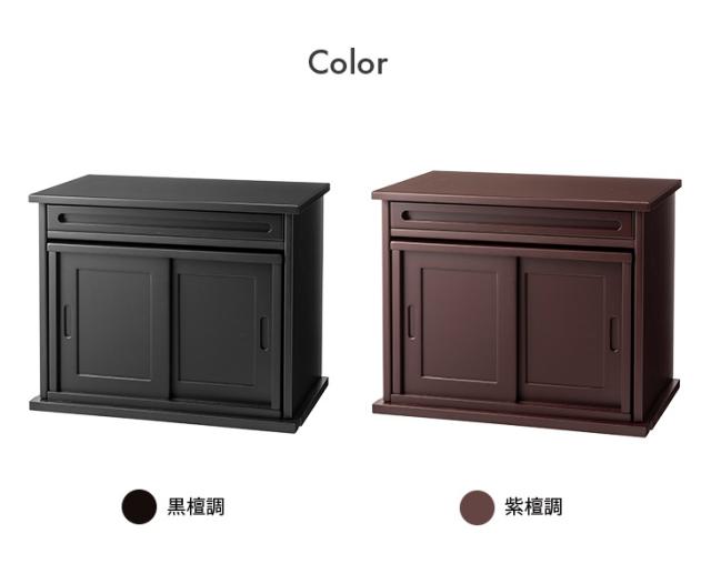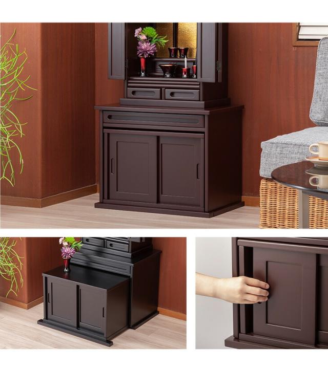 上置きタイプの仏壇にあわせやすい、仏壇専用の下台。引戸の部分は前にスライドさせれば台になり、読経やお供えに便利です。紫檀調、黒檀調の2種類をご用意しました。下台を使うと座ってちょうど良い高さになります。