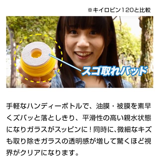 油膜取りでおなじみの“キイロビン”に新アイテムが登場!ガンコな油膜・被膜がとれる外側ガラス専用クリーナーです。手を汚さずサッとスゴとれ!ガラス系ナノパウダー&スゴとれパッドで除去スピード「3倍速」※を実現しました。手軽なハンディーボトルで、油膜・被膜を素早くズバッと落としきり、平滑性の高い親水状態になりガラスがスッピンに!同時に、微細なキズも取り除きガラスの透明感が増して驚くほど視界がクリアになります。