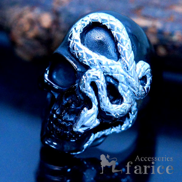 ブラック スカル (骸骨) シルバー スネーク (蛇) ステンレス メンズ リング 指輪