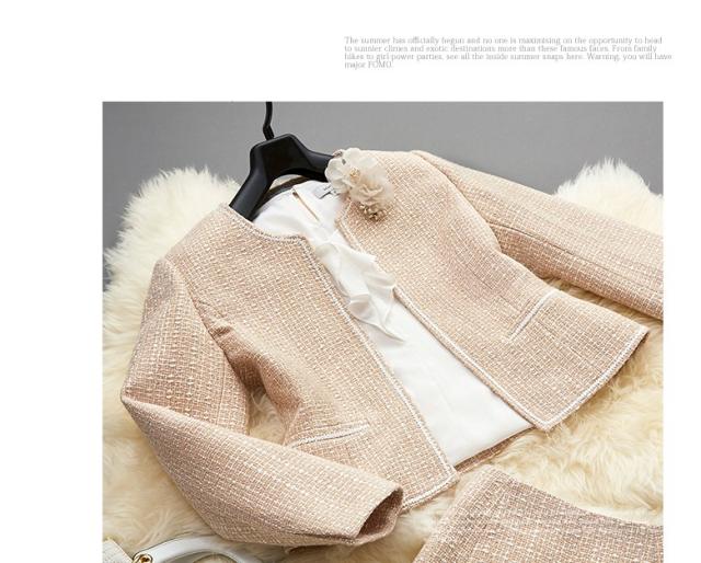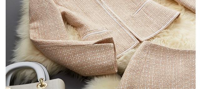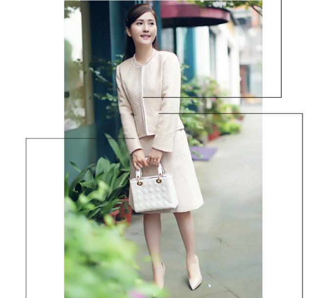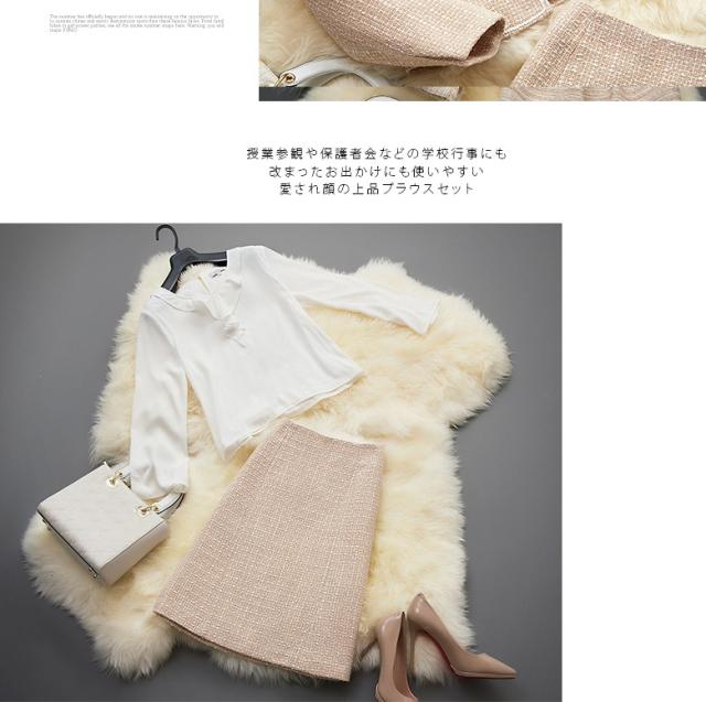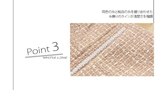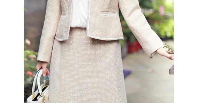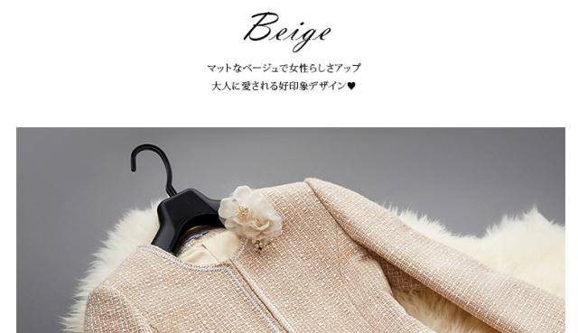 ●ラメのないマット生地の上質感がどんなシーンにも馴染む裏地が付いて着心地あたたか、同色の糸と純白の糸を縒り合わせた糸飾りのラインが清楚さを強調、派手さのない柔らかな印象で目上の方にも好感度の高いスーツ。