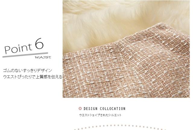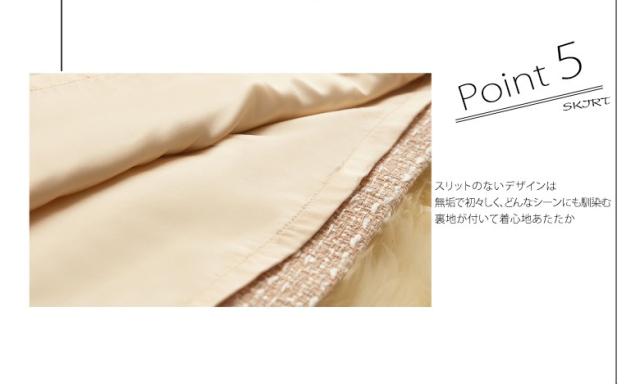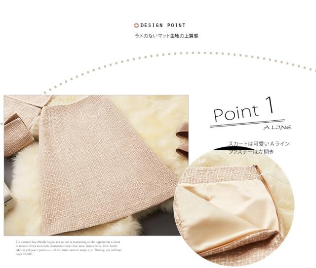スカートは可愛いAラインでファスナーは左開き、ゴムのないすっきりデザイン、ウエストぴったりで上質感を伝える。