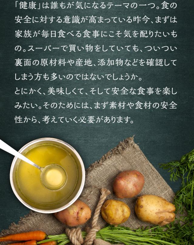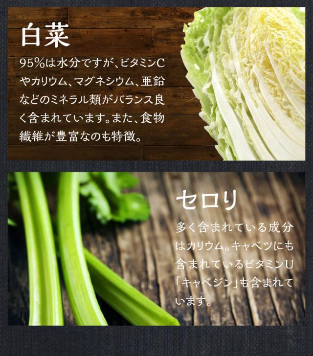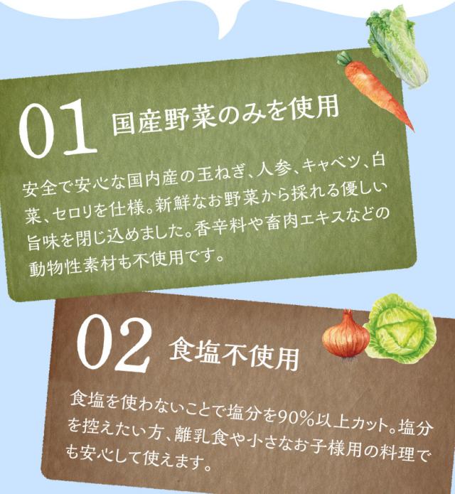 食塩無添加・香辛料不使用、(牛・豚・チキン)畜肉工キスやその他動物性素材不使用、化学調味料不使用。国産5種類の野菜(玉ねぎ、人参、キャベツ、白菜、セロリ)の旨み最大限に活かして本格的に美味しく仕上げました。