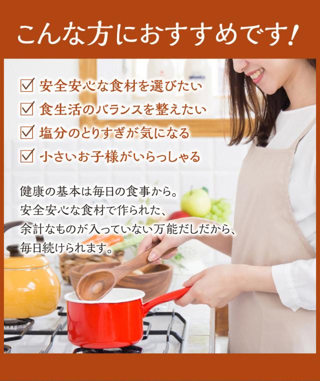 ○開封後は湿気を吸いやすいため吸湿に注意し、冷蔵庫で保存の上お早めにご使用ください。 ○食塩を使用していません。お好みにあわせて塩加減をしていただき、ご家庭の味をおつくりください。 ○ひと振りごとによくかき混ぜてご使用ください。 ○お湯に溶かした際に浮遊物が見られる場合がございますが、品質上問題はございません。 ○中身の色や風味に若干のバラツキが生じる場合がございますが、品質上問題はございません。 ○合わない場合は、利用を中止し医師に相談してください。 ○食生活は主食、主菜、副菜を基本に、食事のバランスを大事にしてください。 ○原材料名をご確認の上、食品アレルギーのある方は召し上がらないでください。 |