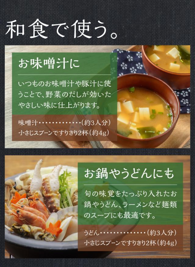さっと溶ける顆粒状で使いやすく、和・洋・中を問わず、様々なお料理にお使いいただけます。離乳食作りのだしとしてもおすすめです。