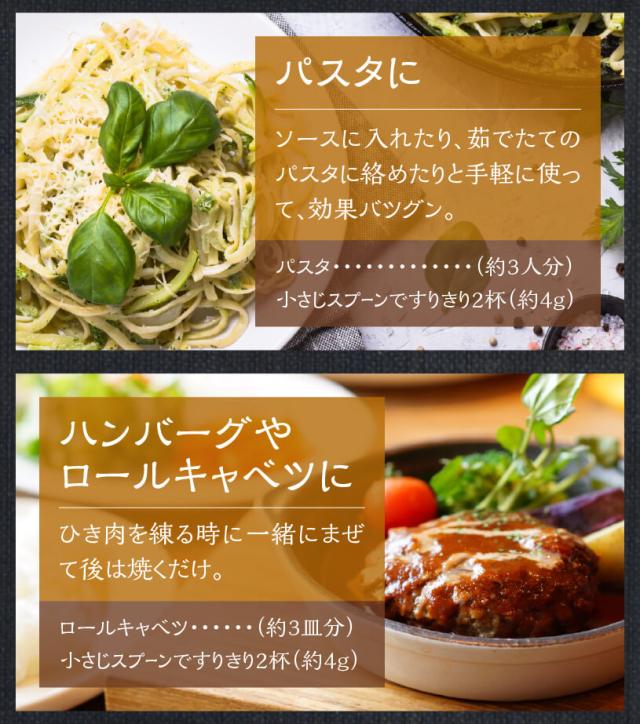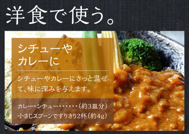 小さじスプーンすりきり2杯(約4g) ○スープ (約3人分) ○味噌汁 (約3人分) ○煮物 (約3人分) ○カレー・シチュー (約3皿) ※食塩を使用しておりませんので、お好みの調味料で味付けしてください。 |
