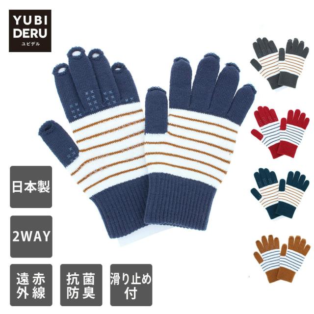 【スマホ対応】【日本製】レディース ニット手袋 ボーダー 2WAY 指先カット 指先が出る 抗菌防臭 遠赤外線 滑り止め付 五本指 指紋認証 スマホ タッチパネル対応 あったか YUBIDERU ユビデル 秋冬 防寒 通勤 通学 自転車 テレビ番組 マツコの知らない世界 ヨークス yorks