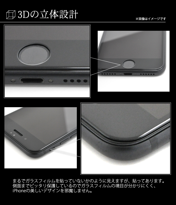 3Dの立体設計でiPhone6/iPhone6sの前面の画面全体を守る3D液晶保護ガラスフィルム。 iPhoneのデザインを邪魔しないデザインでフィルムを貼っていることを感じさせません。