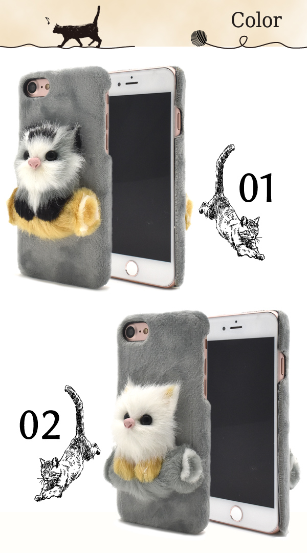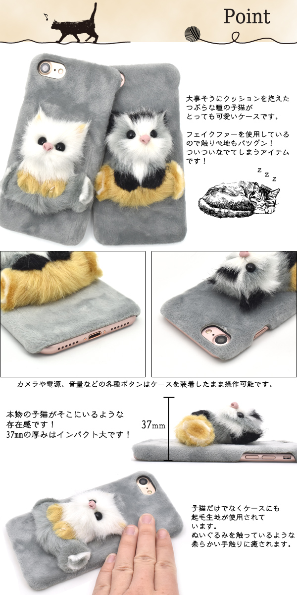 大事そうにクッションを抱えたつぶらな瞳の子猫がとっても可愛いケースです。フェイクファーを使用しているので触り心地もバツグン!
